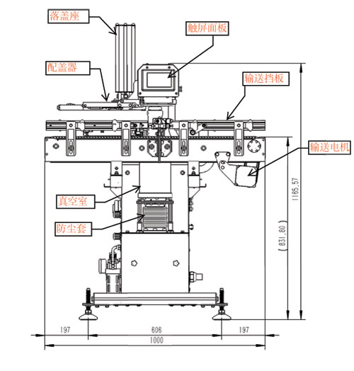 完成灌裝工序沒有加蓋子的瓶子從機(jī)器的進(jìn)出罐輸送左側(cè)進(jìn)入,在輸送器的兩側(cè)擋板上裝有氣動的擋罐裝置,擋罐器的作用是確保每次只有一個(gè)瓶子進(jìn)入推送位置,并且在在抽真空旋蓋過程中其它瓶子不會誤入。